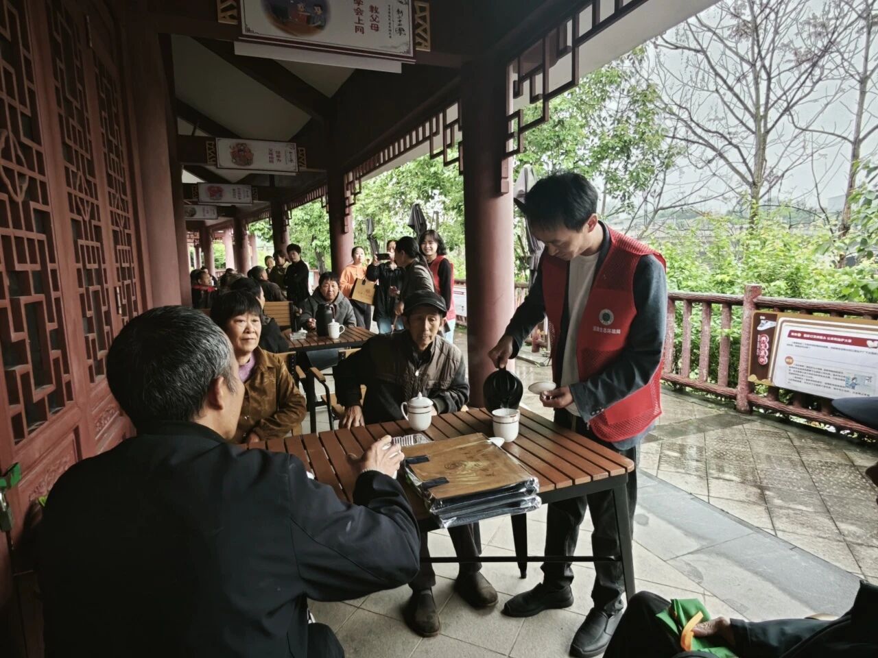 在沿滩镇的一家茶馆里,迎来了一位特殊的“店小二”。他身穿醒目的“乡村环保茶馆店小二”红马甲,动作熟练地为客人斟茶倒水。这位忙碌的“店小二”,正是沿滩镇环保办负责人何超。自该茶馆以“乡村环保茶馆”开张以来,他以“乡村环保茶馆店小二”的身份“泡”在茶馆里,主动沉浸到这方烟火气十足的空间里。如今,这间小小的茶馆已不再只是寻常的饮茶场所,更成了沿滩镇上传播环保理念、沟通民情的最前沿“据点”。
