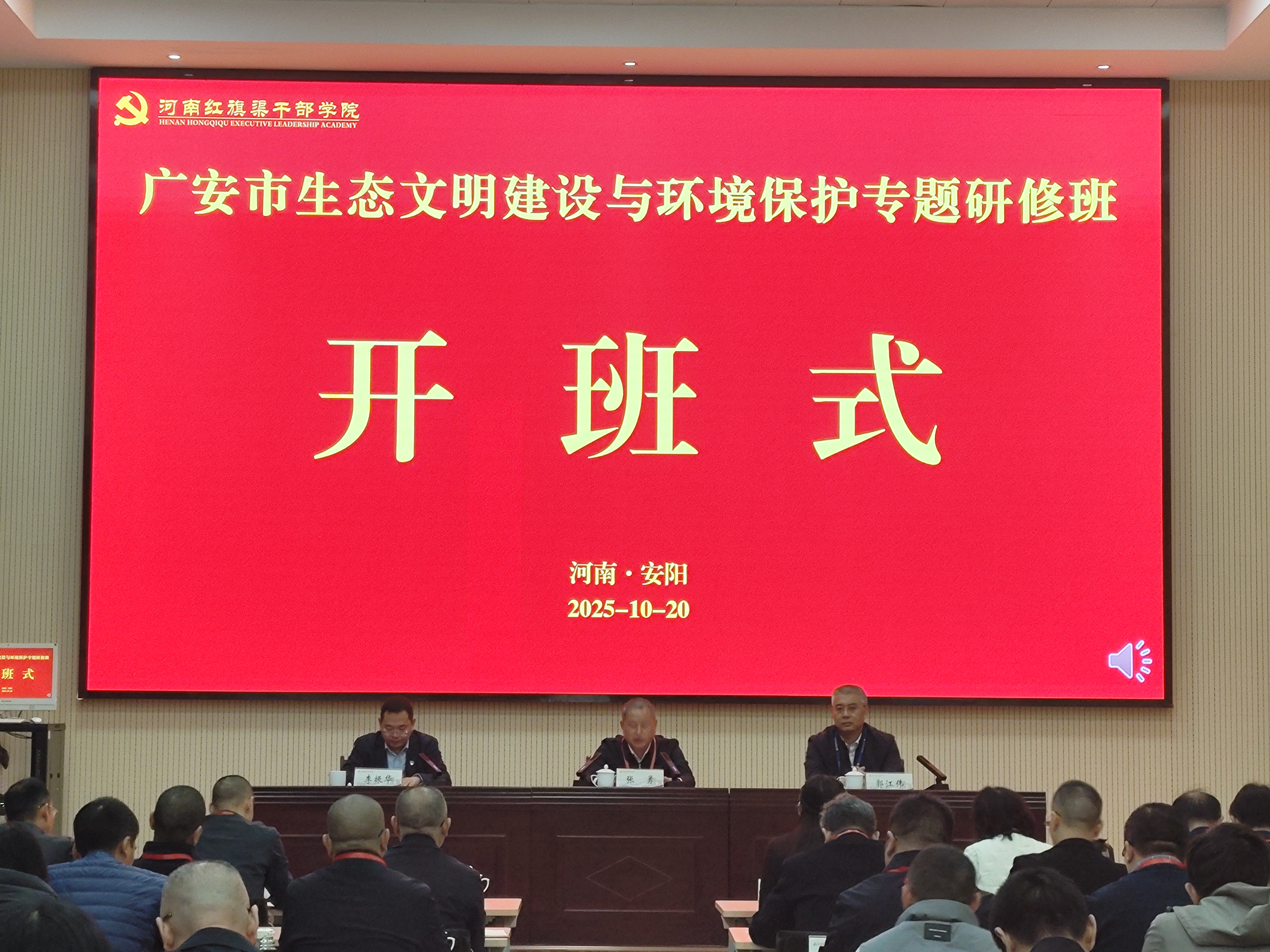 广安市生态环境保护委员会办公室主任、市生态环境局党组书记、局长张勇,河南红旗渠干部学院党委委员、副院长郭江伟出席开班仪式。仪式上,全体学员奏唱国歌,举行授班旗仪式,郭江伟同志致辞,张勇局长作开班讲话,最后合影留念。