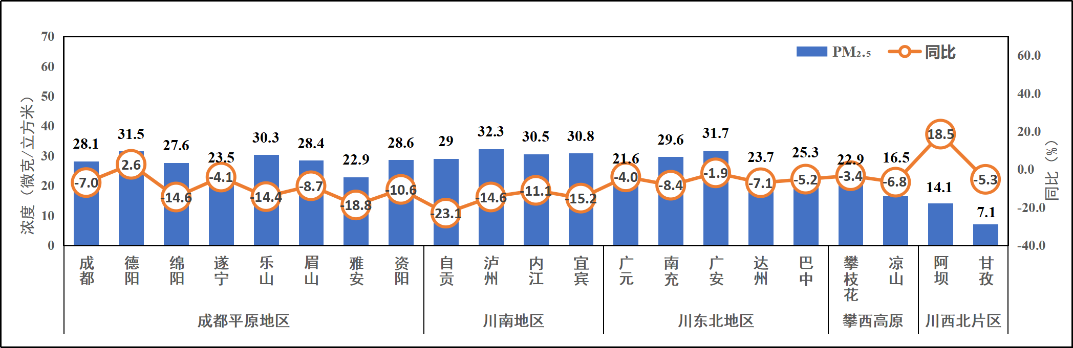 图2 2025年1-10月全省PM2.5浓度及同比变化