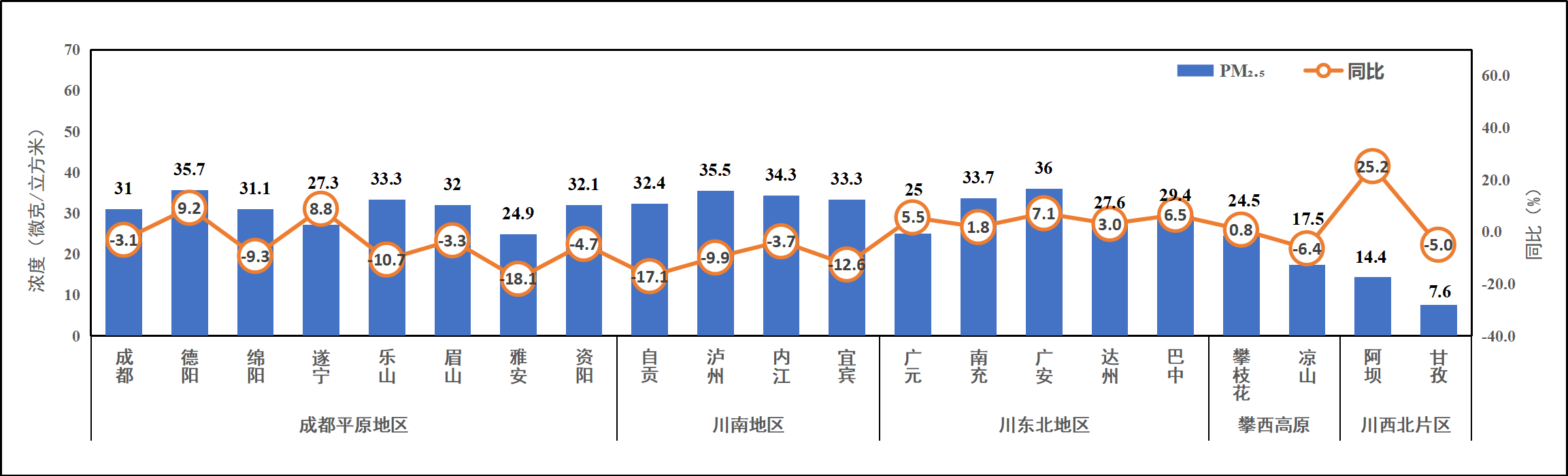 图2 2025年1-8月全省PM2.5浓度及同比变化