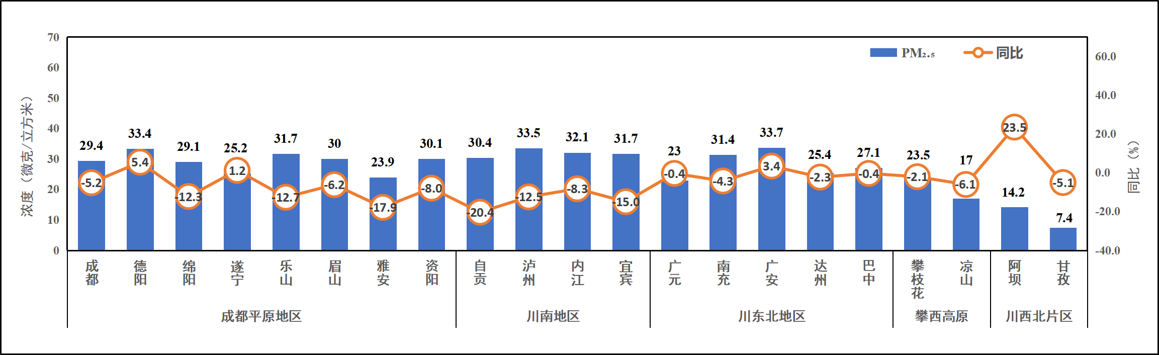 图2 2025年1-9月全省PM2.5浓度及同比变化