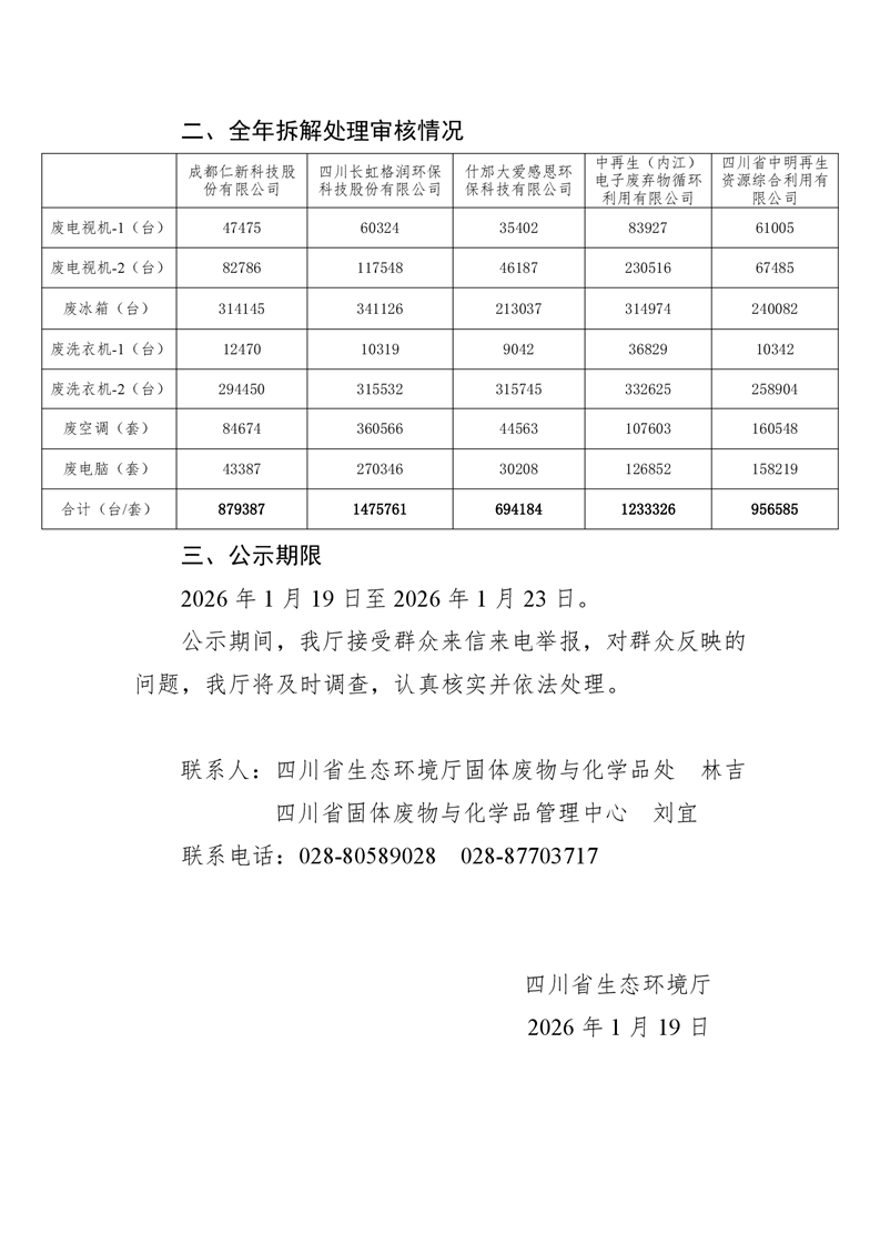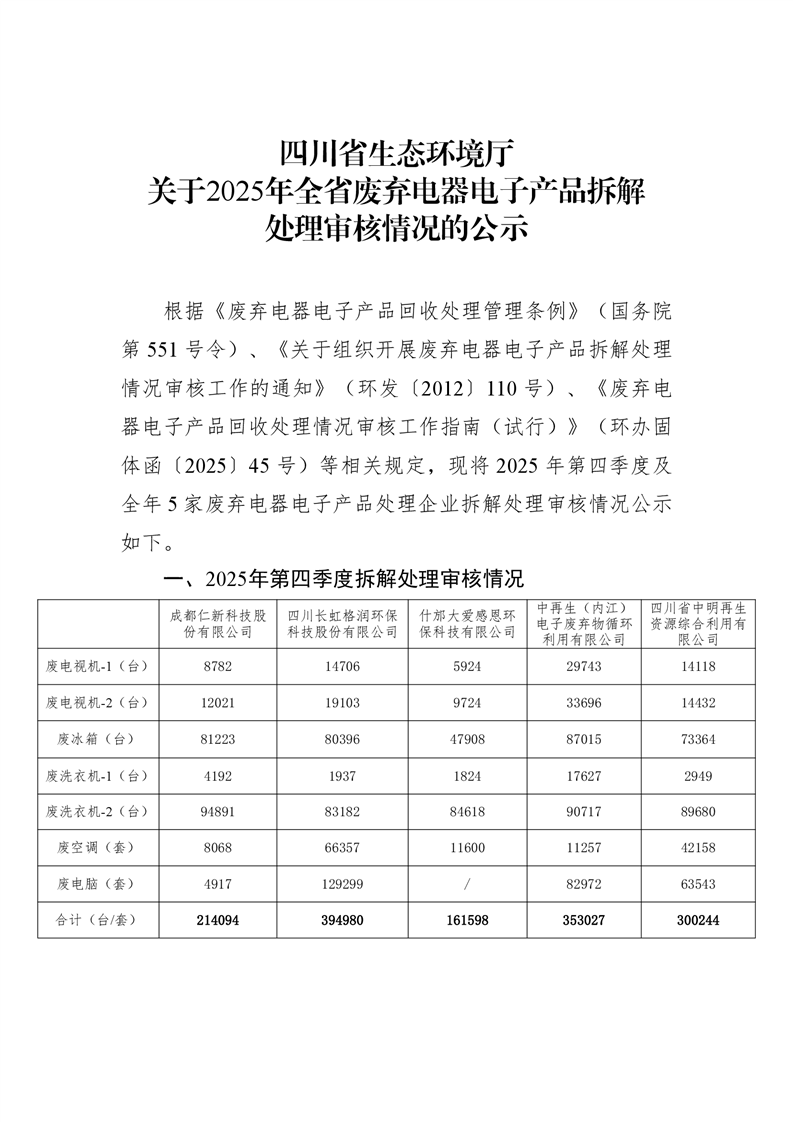 四川省生态环境厅关于2025年全省废弃电器电子产品拆解处理审核情况的公示