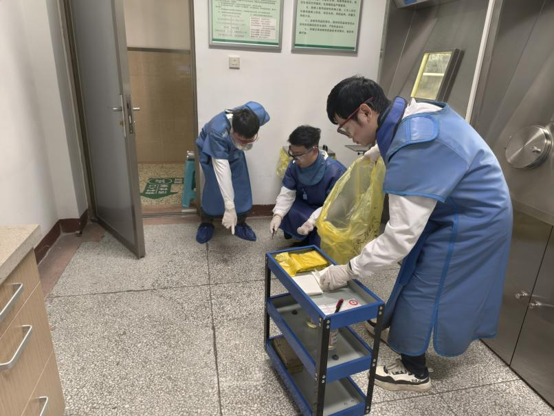 以“实际场景”锚定风险。演练场景精准对标核医学日常操作痛点——针对¹³¹I药物制备中“试剂瓶接口松动+技师操作碰撞”的高频隐患,设置约4mCi¹³¹I溶液洒漏事故;全程在活性室、处置区等日常工作场所开展,应急物资存放、疏散通道标识均保持日常状态,未因演练额外调整,确保每个处置动作都“源于日常、用于实战”。