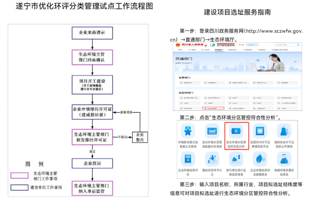 在不断夯实试点细节基础上,遂宁市生态环境局提前介入、超前服务,全面推行试点项目选址预审服务,充分运用试点行业生态环境分区管控细化成果科学研判试点项目的环境可行性,避免出现重大方向性问题,确保试点项目不因选址和环评受限,不发生重大生态环境问题,全力以赴做好稳增长服务保障。