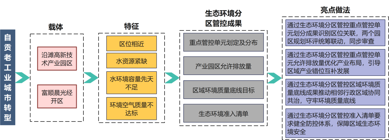 自贡市是中国盐业的发祥地之一,经历了上世纪50年代末的三年化工城建设和60年代的“三线建设”,被列为全国首批老工业城市和资源型城市产业转型升级示范区。为深入推进老工业城市调整改造和资源型地区转型发展,自贡拟以沿滩高新技术产业园区、四川富顺晨光经济开发区为载体,全力打造国际先进、国内一流、独具特色的,以先进氟材料为龙头的绿色化工产业基地。2022年以来,自贡市为推动辖区化工园区申报认定及扩区建设,先后启动两个园区规划环评工作,四川省生态环境厅充分运用生态环境分区管控成果识别出区域发展存在水资源紧缺、水环境容量先天不足、环境空气质量不达标等资源环境问题及制约因素。