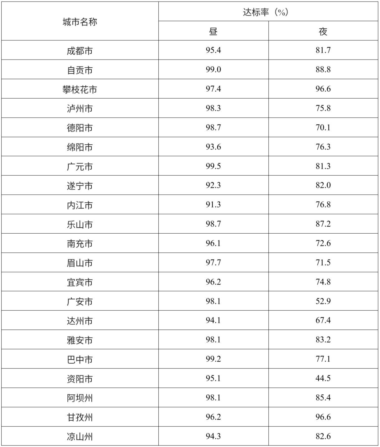 2025年9月四川省功能区声环境质量昼间达标率为96.5%,夜间达标率为77.4%,详见表1-1、图1-1。
